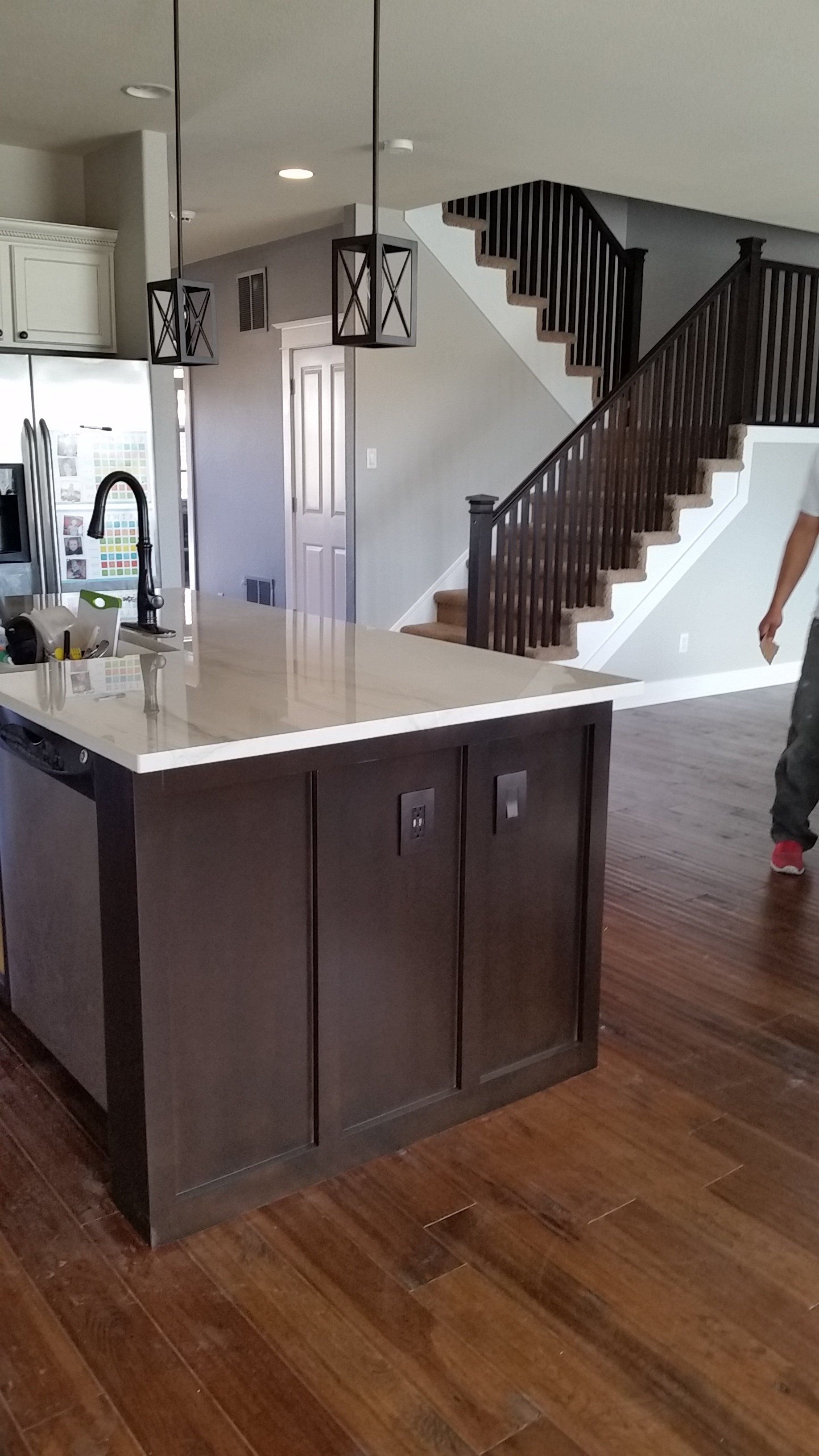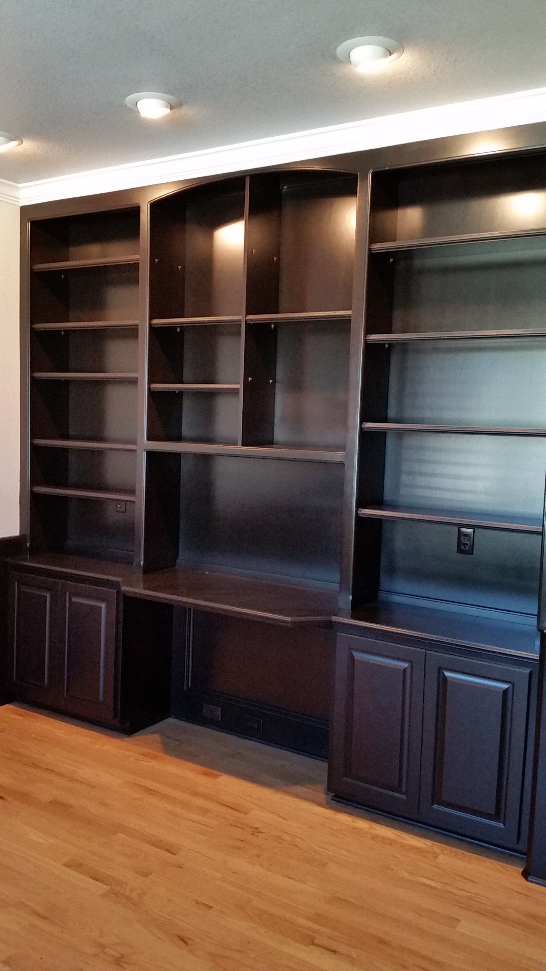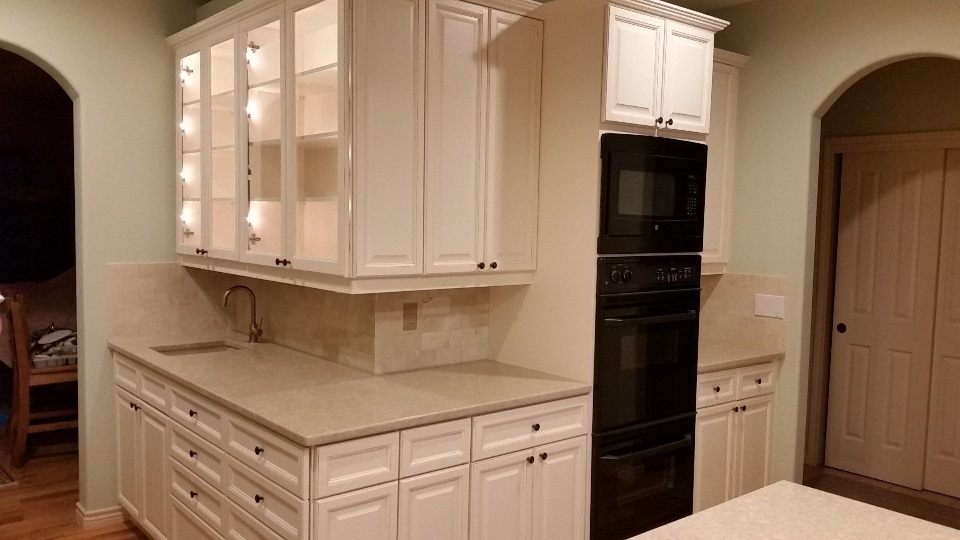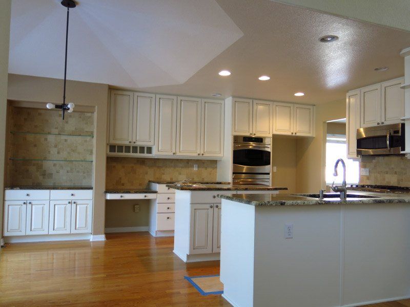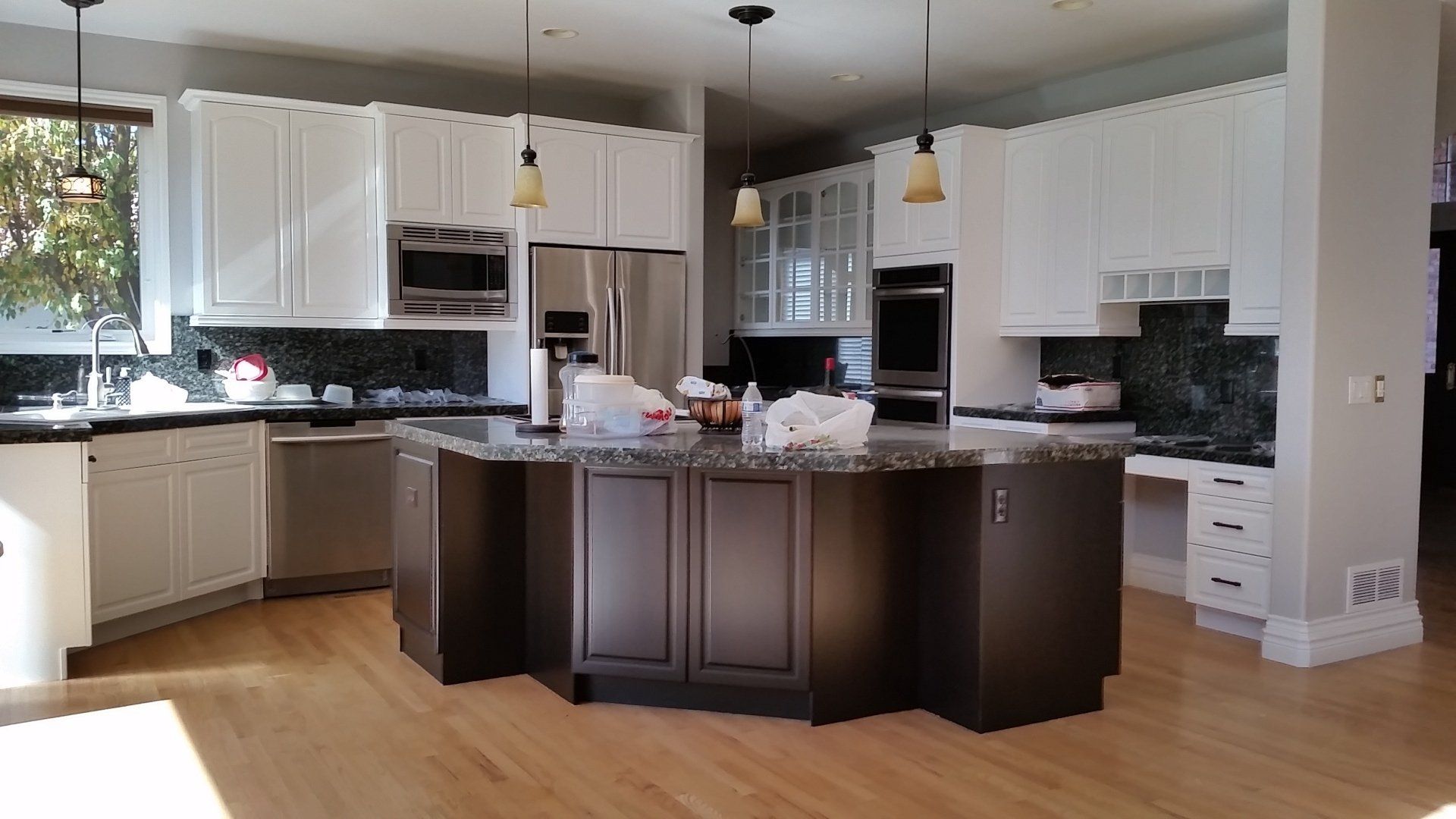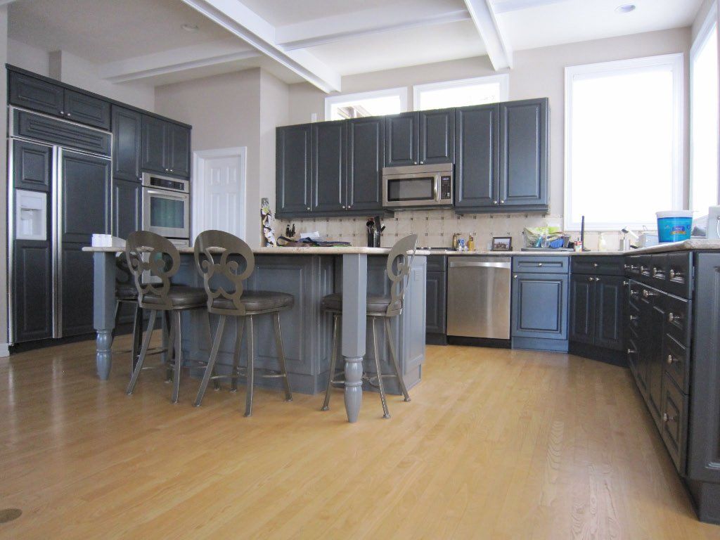 " Our customer desired an updated bold look to match her backsplash, floors and new countertops. She went with a Ben Moore *Advance Color: "Midnight Dream 2129-10 and was very pleased with the results. She also decided to take the color into her great room and complete the inset wall shelves in the same color."