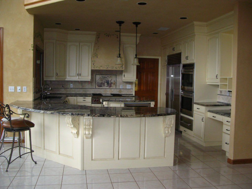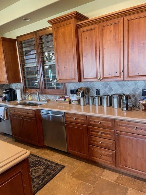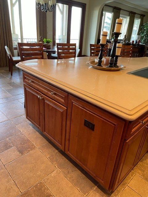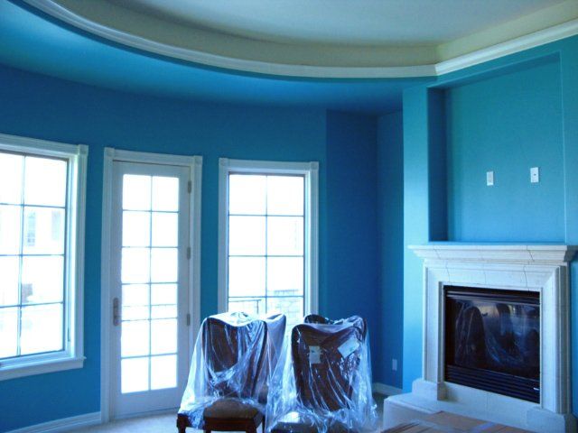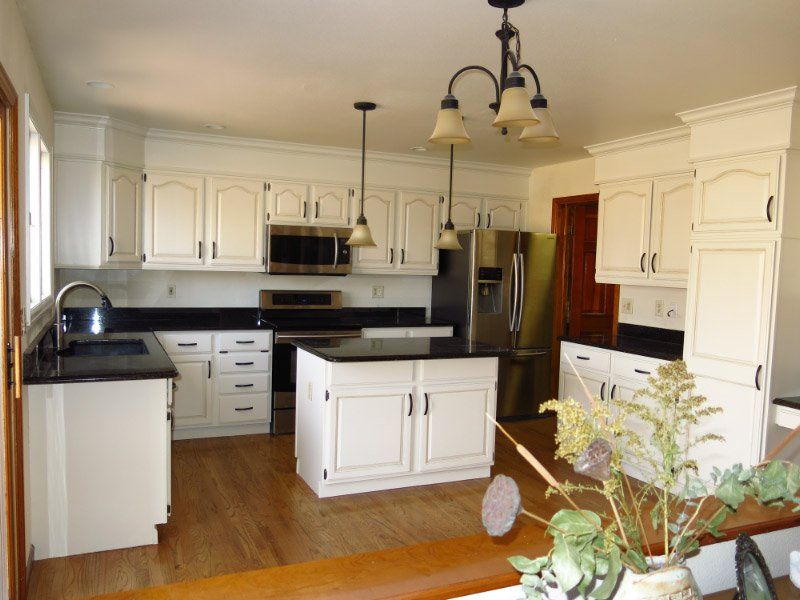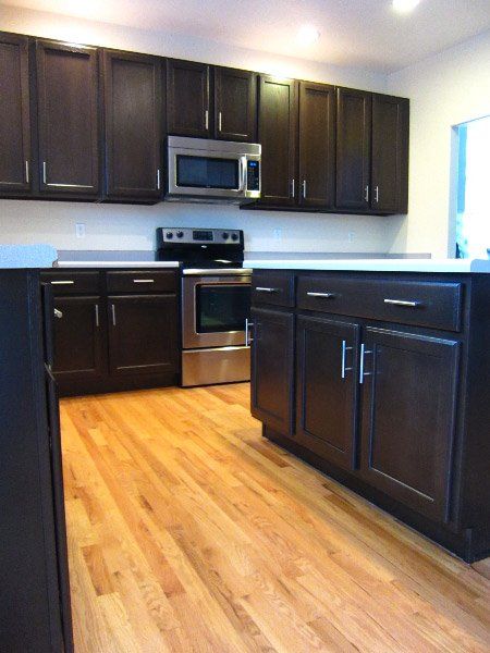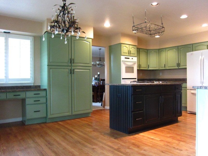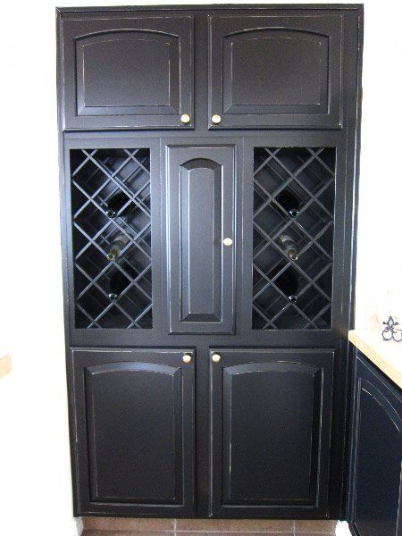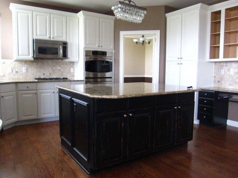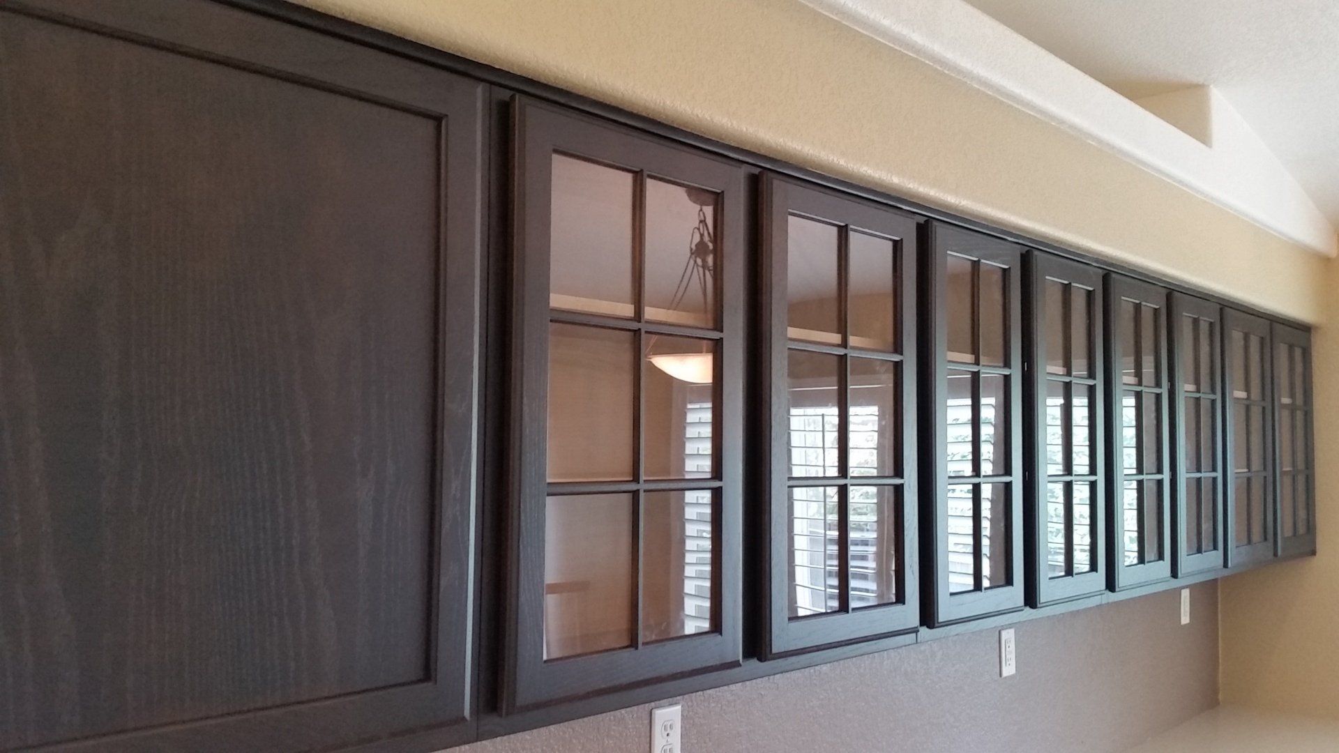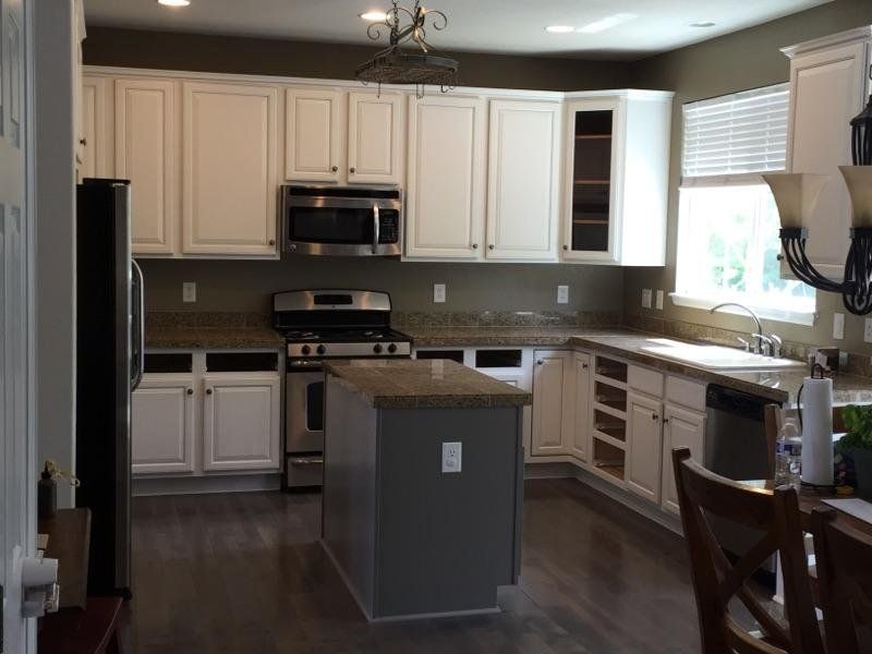 " Our customer desired an updated bold look to match her backsplash, floors and new countertops. She went with a Ben Moore *Advance Color: "Midnight Dream 2129-10 and was very pleased with the results. She also decided to take the color into her great room and complete the inset wall shelves in the same color."