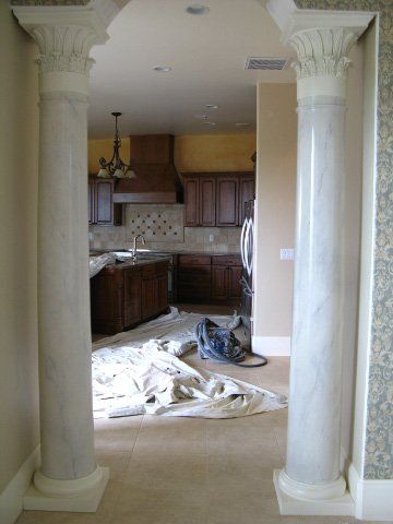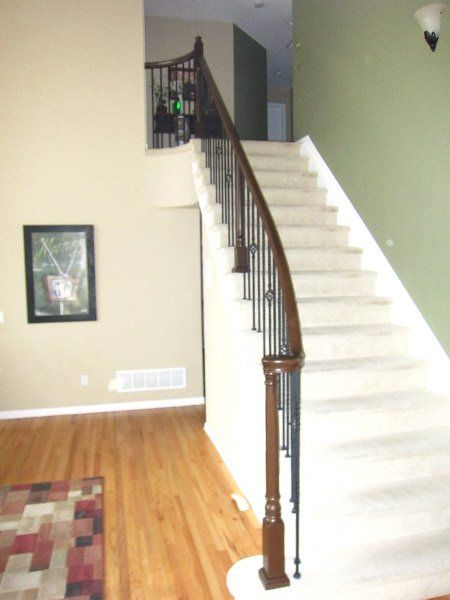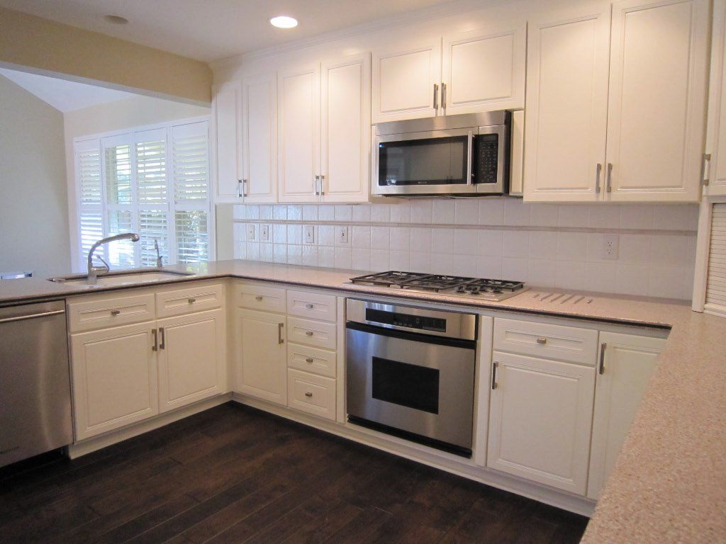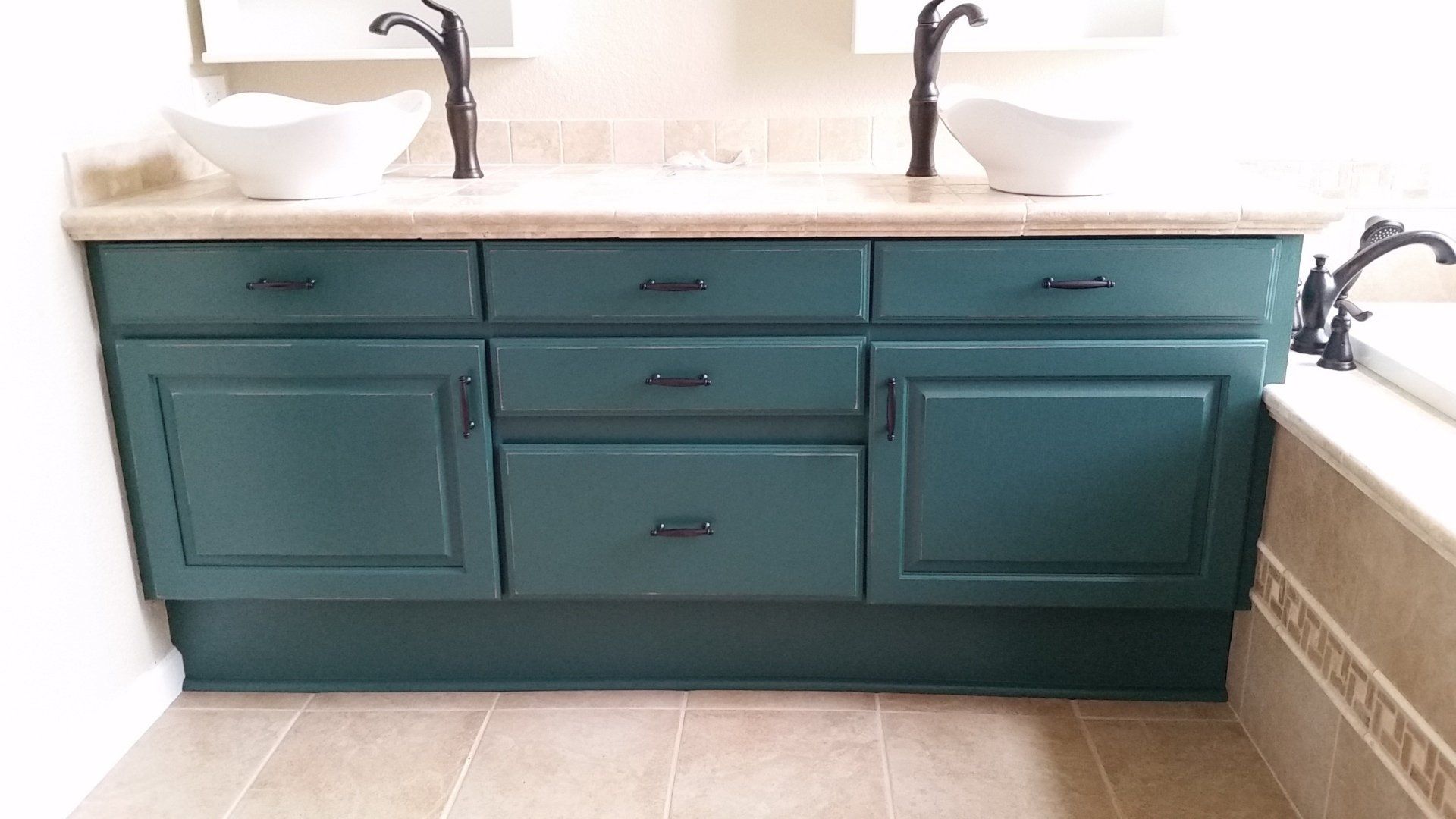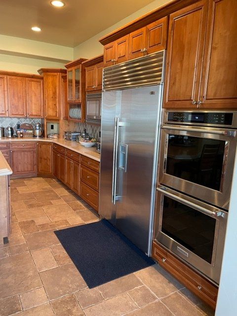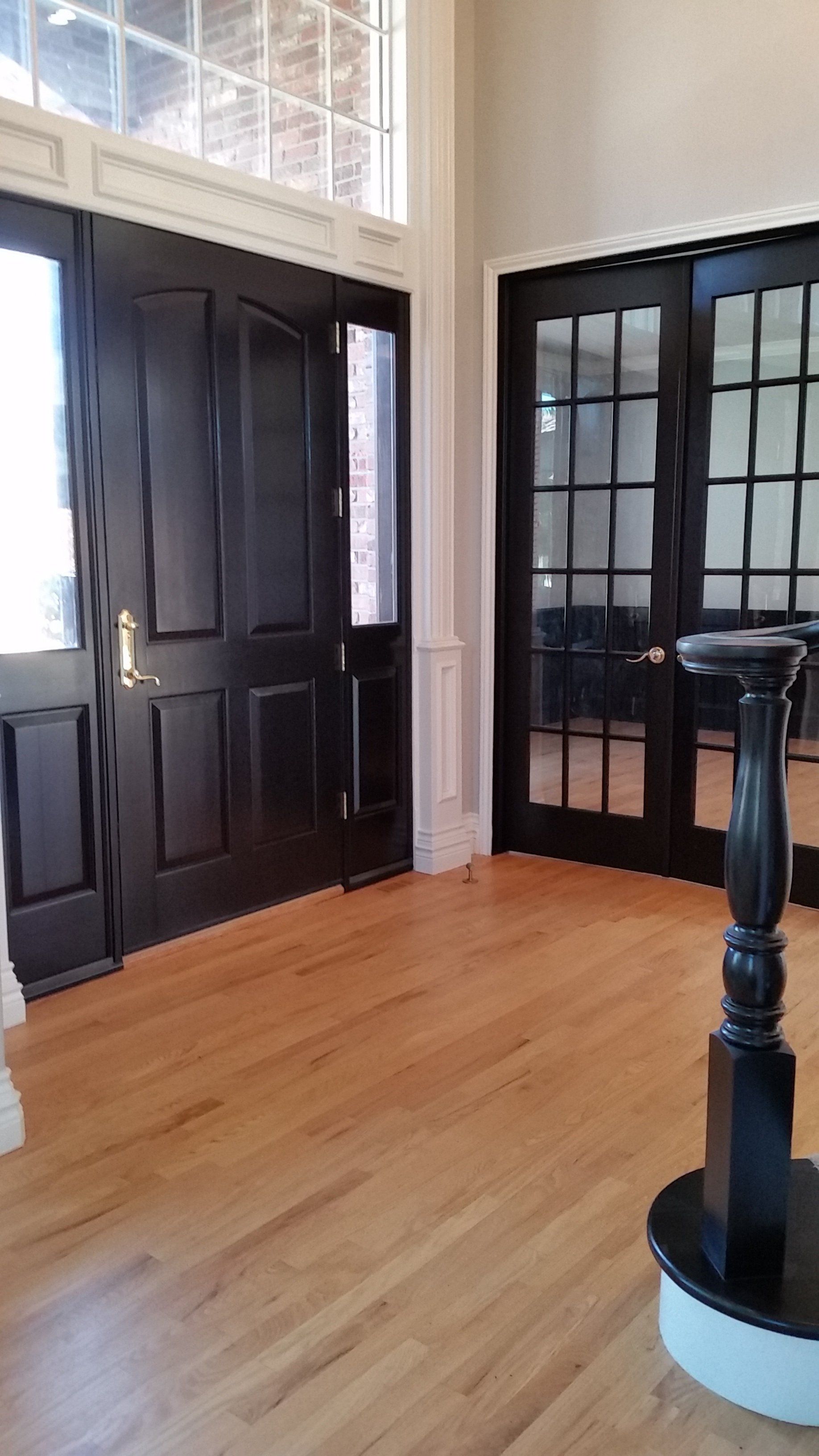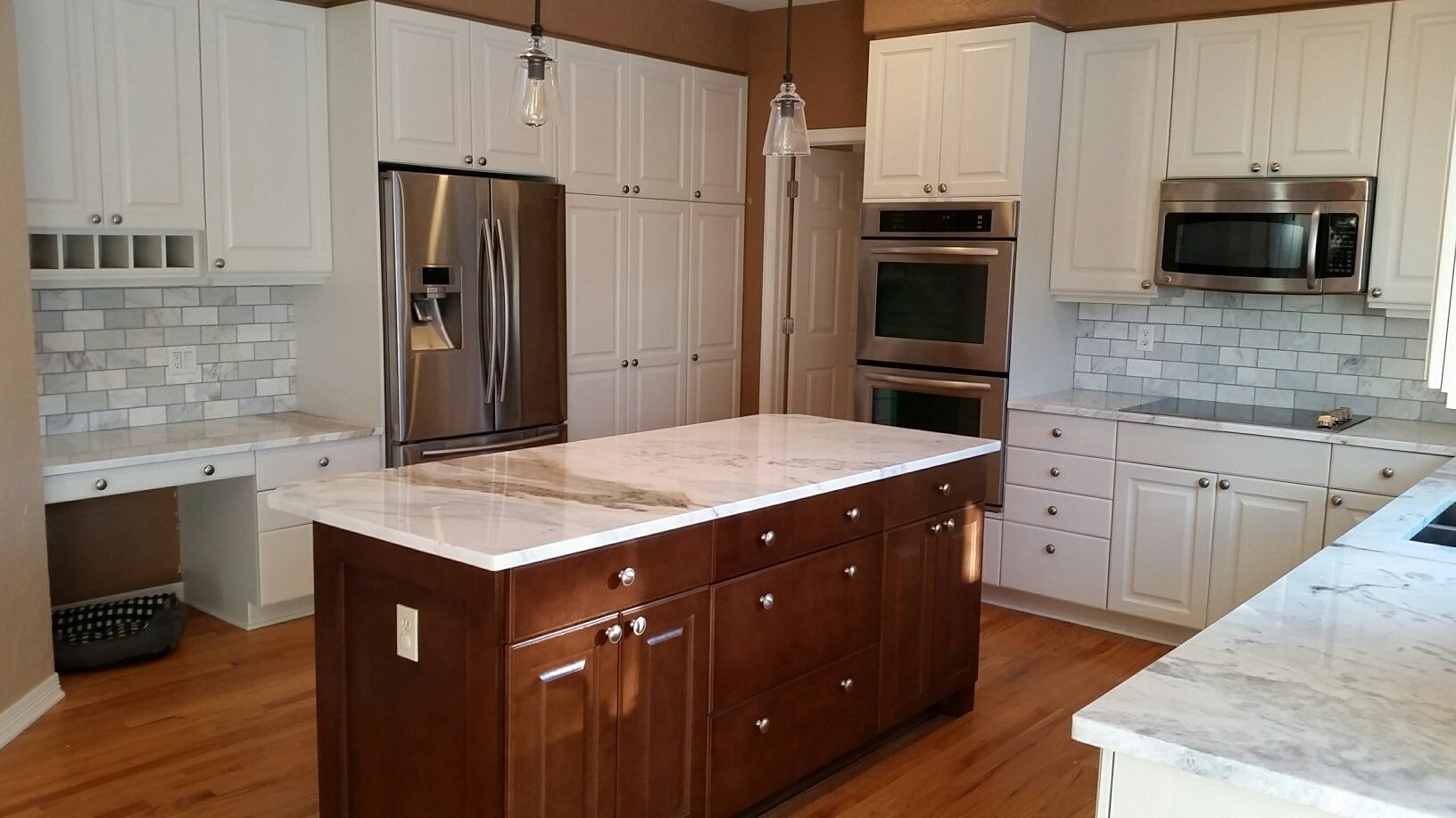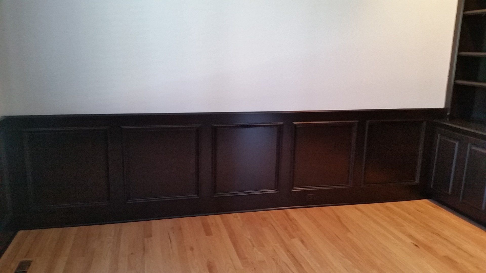 " Our customer desired an updated bold look to match her backsplash, floors and new countertops. She went with a Ben Moore *Advance Color: "Midnight Dream 2129-10 and was very pleased with the results. She also decided to take the color into her great room and complete the inset wall shelves in the same color."